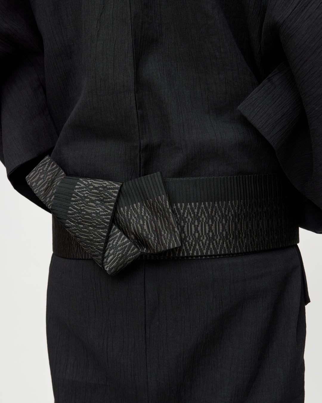 きもの着用時の悩みとして多い“帯結びの難しさ”を解消すべく、新発想の帯「締帯(しめおび)」を開発しました。Y. & SONSではブランド創設以来、着物の着用における“帯結び”のハードルを下げるべく、さまざまなアプローチを重ねてきました。ベルトで留めるきものや、ウール・タオル地による兵児帯の開発もその一環です。今回開発した「締帯」は、シンプルで扱いやすい「伊達締め」の構造を応用し、伝統的な角帯の凛とした端正な佇まいを損なわず、兵児帯のような扱いやすさを実現させた帯です。