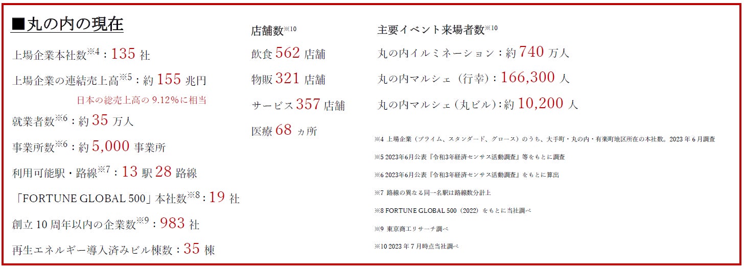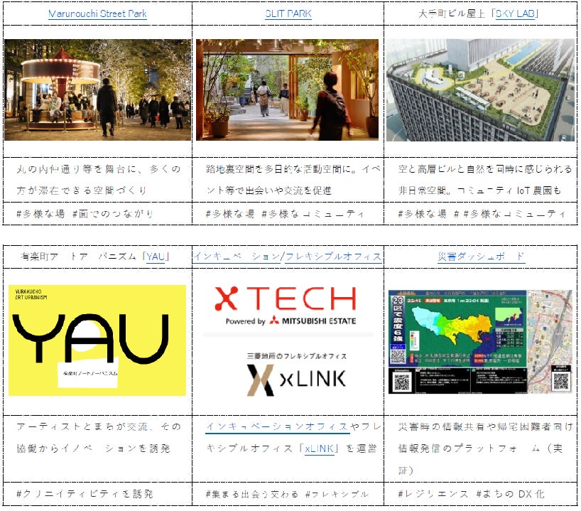 日本経済を先導するビジネス街「丸の内」、グローバルな金融センターでありメディア企業も集積する「大手町」、ショッピングやグルメ、エンターテインメントなど多彩な魅力が混在する「有楽町」。三菱地所グループは今後も、それぞれのエリアのポテンシャルを拡張しながら、価値観やライフスタイル、事業環境等のパラダイムシフトをいち早く捉え、ユーザーとの価値協創やオープンなまちづくりを通じて価値創造を図り、日本の明るい未来を切り拓いてまいります。