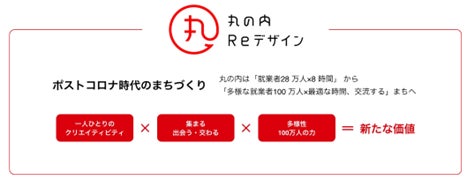 ▲2020年以降の丸の内エリアでのまちづくりを「丸の内NEXTステージ」と位置付け、“人・企業が集まり交わることで新たな「価値」を生み出す舞台”の創造を標榜。「丸の内Reデザイン」はその実現に向け、まちづくりのあり方から変えていくコンセプトワード