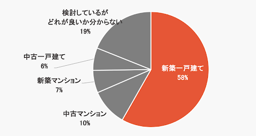 「新築一戸建て」が58%、次いで「中古マンション」10%、「新築マンション」7%、「中古一戸建て」が6%となりました。その他、「検討しているが、どれが良いか分からない」という回答が19%にのぼりました。