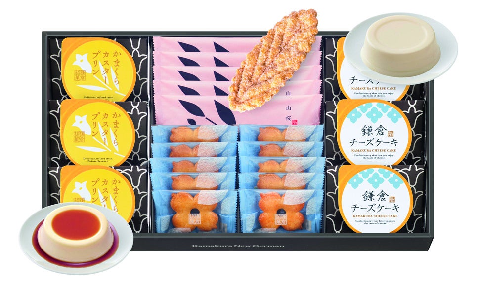 なめらかでコクのあるカスタードプリン,濃厚な味わいのチーズケーキと,鎌倉の風物をモチーフにしたスイーツの詰合せです。