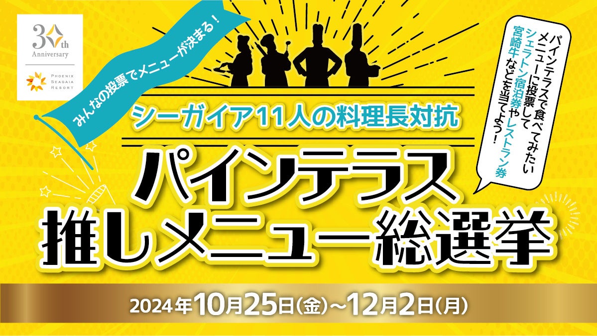 シーガイア30周年を記念して「パインテラス推しメニュー総選挙」を開催いたします。シーガイアの11名の料理長が腕を振るい、シェラトン・グランデ・オーシャンリゾート1階ガーデンビュッフェ「パインテラス」でお客様に味わっていただきたいメニューを考案。本日10月25日(金)より投票受付を開始いたしました。
