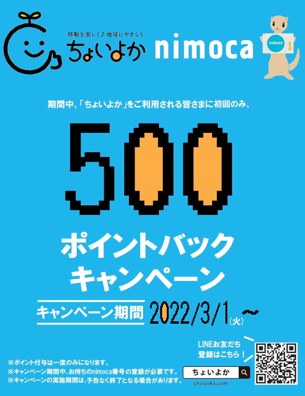 - [2]【交通・お買い物で使えるnimocaポイントが返ってくる!】ちょいよかユーザーへポイントバックキャンペーン実施!