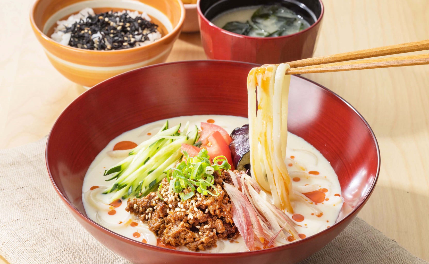 夏野菜(トマト、茄子、きゅうり、みょうが)をピリ辛の肉味噌と和えて食べる、ひんやりコク旨な豆乳担々うどん。 夏バテ気味でもつるりと食べやすく、栄養豊富な豆乳スープが身体を優しく労わります。 肉味噌は豚ひき肉を豆味噌ベースに、生姜、四川豆板醤、花椒を効かせた“シビ辛味”で後を引きます。しそひじきご飯との相性は抜群で、肉味噌を少しだけご飯の上に乗せて食べるのオススメです。