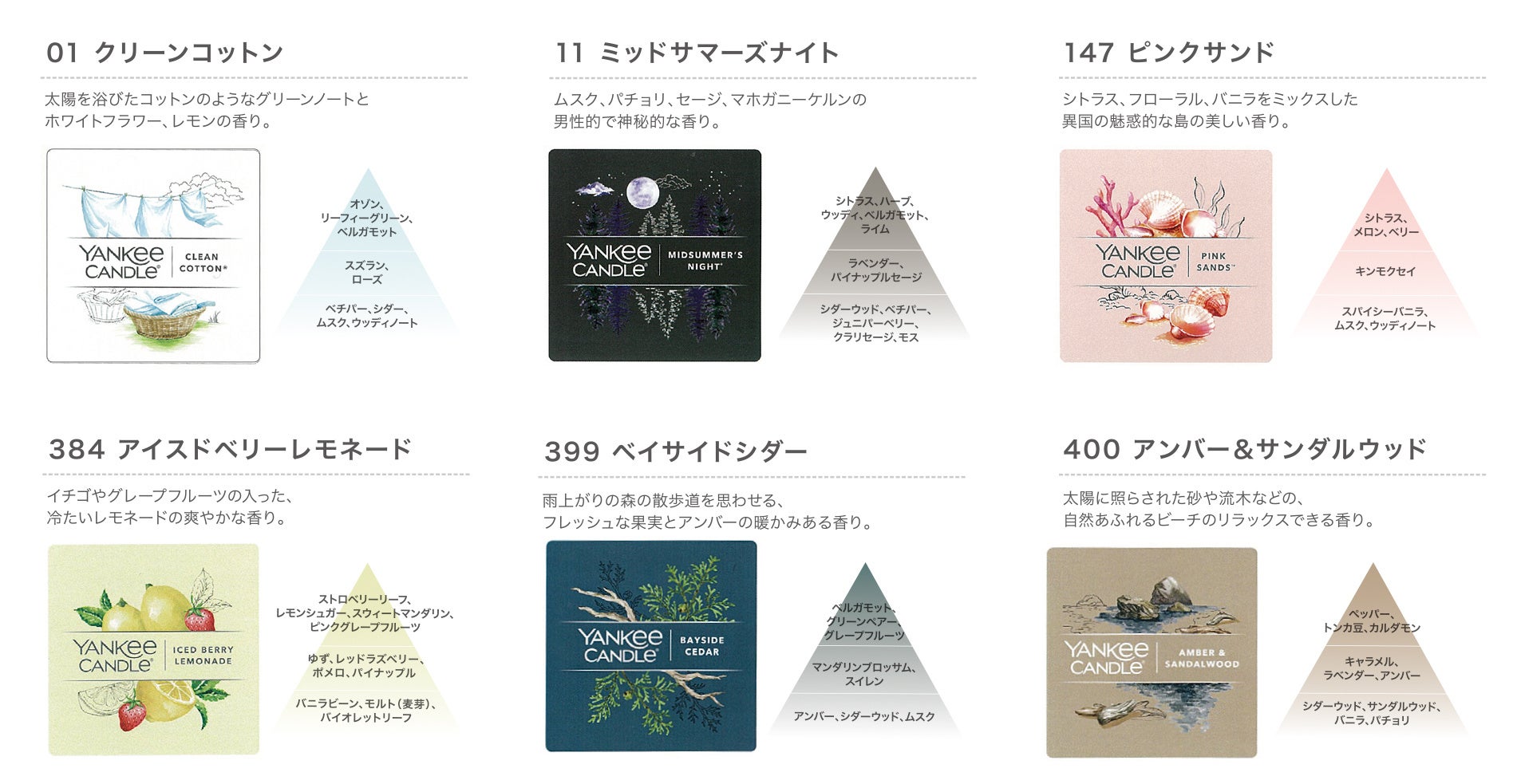 アイスドベリーレモネード、ミッドサマーズナイト、ピンクサンド、ベイサイドシダー、クリーンコットン、アンバー&サンダルウッド