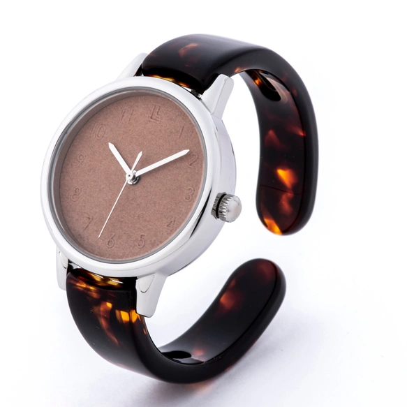 鯖江市の眼鏡づくりと越前漆器の職人技で生まれたバングルウォッチ。文字盤には越前和紙があしらわれた、伝統工芸のコラボレーション作品です。
