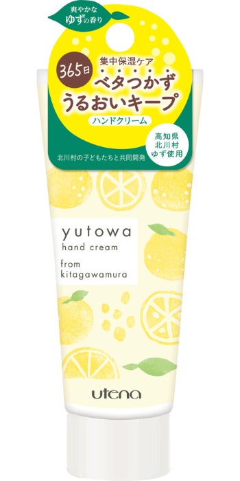 当商品は「北川村を盛り上げたい!」という熱い想いをもった、高知県北川村の公営探究塾に参加する子どもたちとウテナ、ウエルシアの共同開発商品です。昨年、共同開発品第2弾として発売して好評を博した「ユトワ ハンドクリーム」をリニューアルするかたちで、第3弾として「ユトワ ハンドクリームA」の発売に至りました。本来捨てられるはずだったゆずの種から抽出した「ユズ種子油」をうるおい成分として配合。爽やかなゆずの香りを楽しみながら、乾燥しがちな手肌をしっとりたもちます。