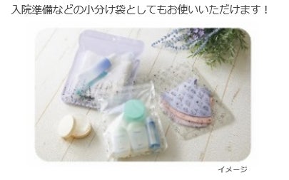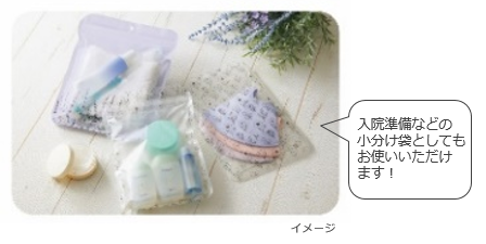 商品パッケージは、イラストが描かれたジップ付きのパッケージで、入院準備などの小分け袋としても活用できます。お使いいただきやすいよう、商品に関する情報は取り外し可能な口紙に記載しました。(品質表示は商品本体についています。)