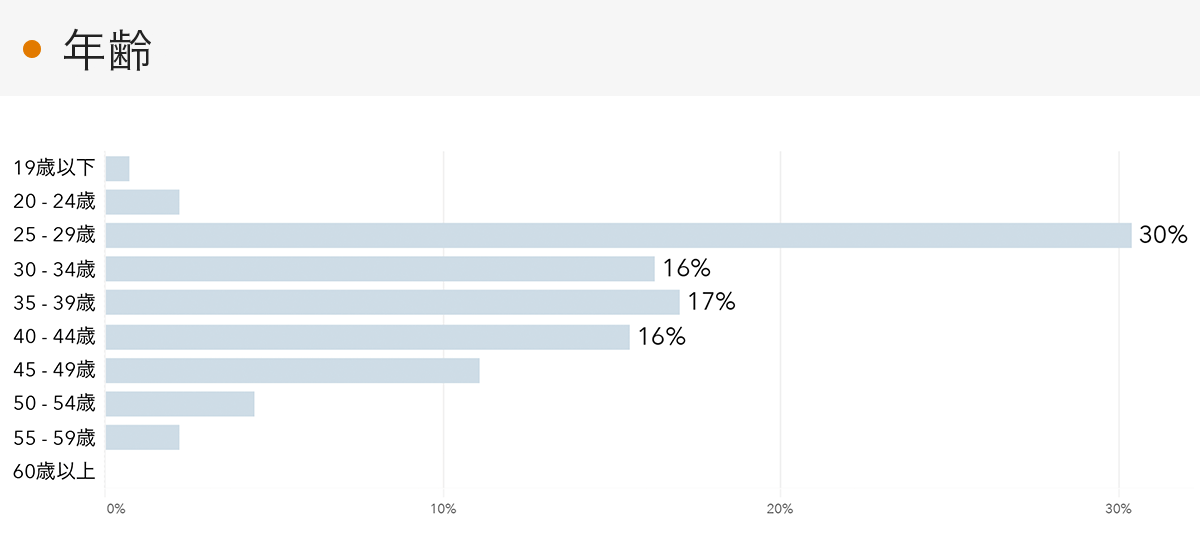 最も割合の多い年齢帯は25〜29歳で30%(前月比3ptアップ)、次に多い割合は35〜39歳の17%、続いて30〜34歳と40〜44歳が同率で16%と続きます。