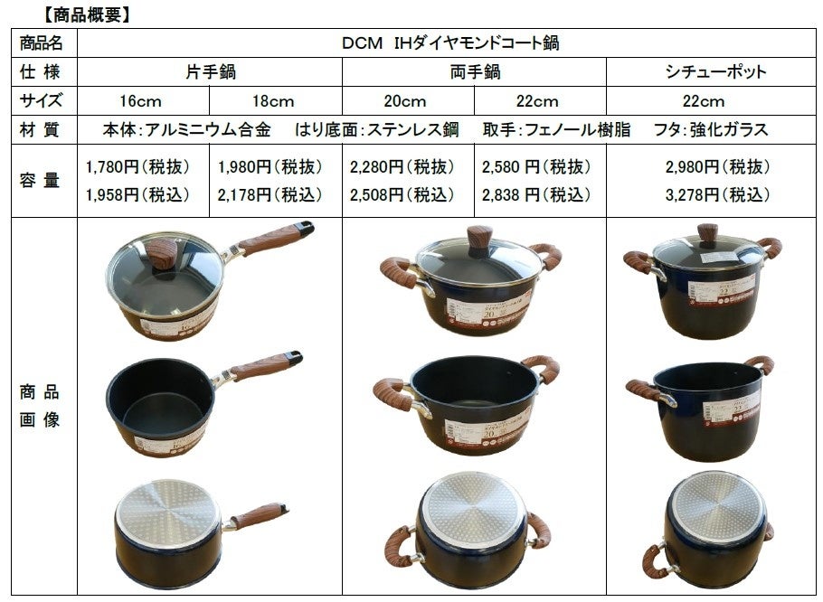 在宅時間が増える中、外出を控え、ご家庭で料理を楽しむ方が増えています。そのような中、DCMでは、耐摩耗性に優れ、こびりつきにくさが長続きする「DCM IHダイヤモンドコートフライパン」を販売しご好評いただいています。このたびDCMはフライパンに加え、高機能な「DCM IHダイヤモンドコート鍋」をお求めやすい価格にて発売します。用途ごとに「片手鍋・両手鍋・シチューポット」をご用意しており、料理にあわせてお選びいただけます。