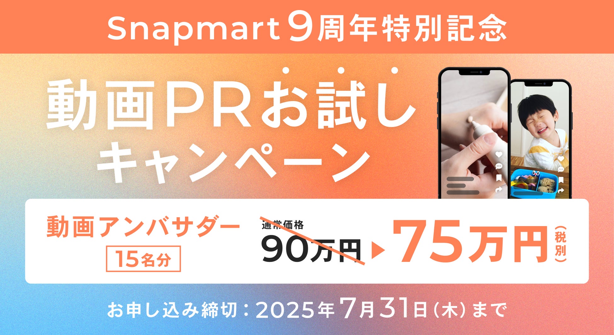 株式会社CREAVE(本社:東京都千代田区、代表取締役社長:中村真奈、以下 CREAVE)が運営するクリエイター向けアプリ「Snapmart」は、今年で9周年を迎えることができました。この成長を支えてくださった企業のマーケティングご担当者の皆さまへの感謝の気持ちを込めて、9周年記念「動画PRお試しキャンペーン」を開催します。