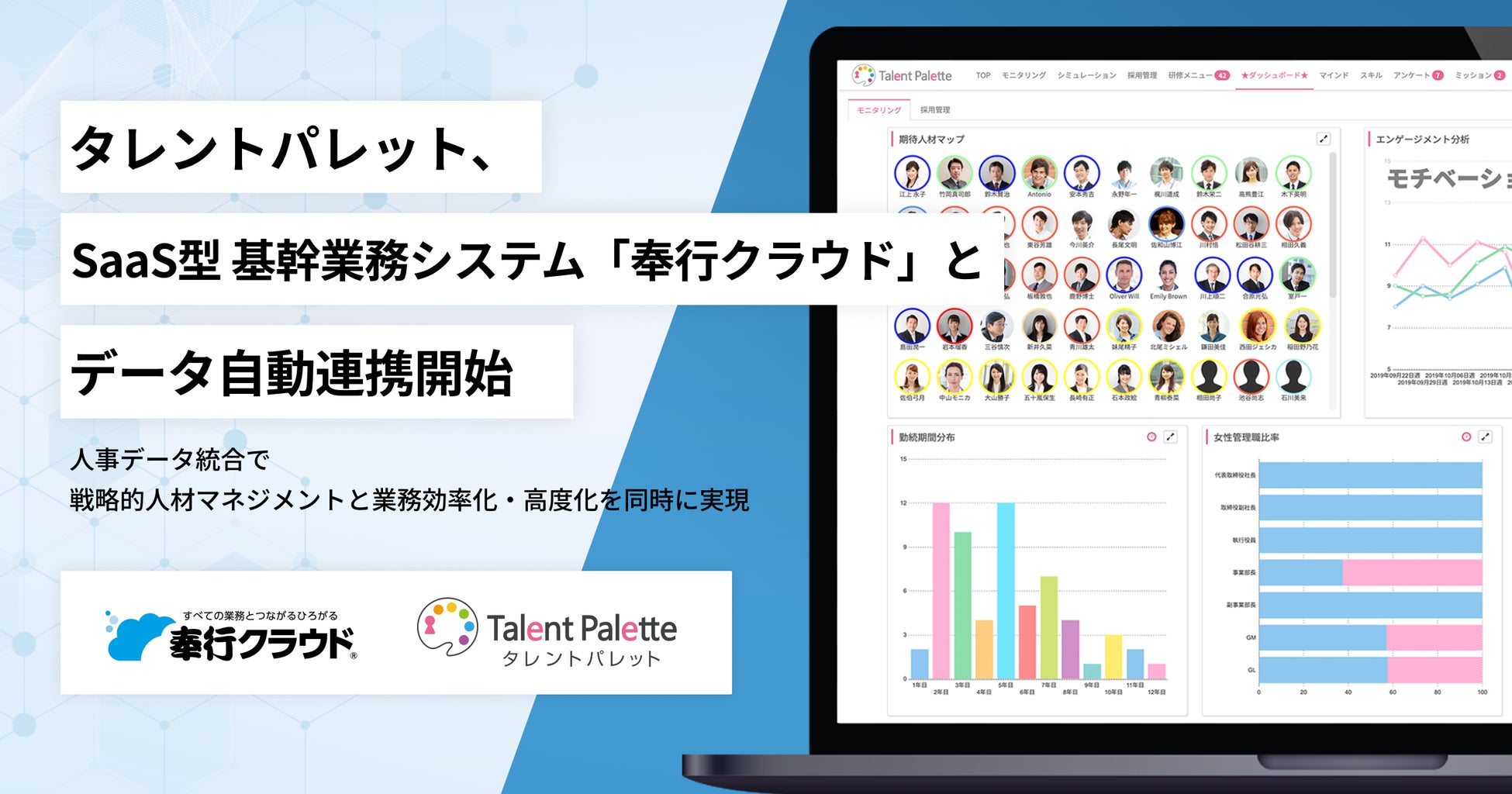 株式会社プラスアルファ・コンサルティング(本社:東京都港区、代表取締役社長:三室克哉、証券コード:4071)は、人的資本経営や健康経営の推進や働き方改革などを目的に、多くの企業で導入が進んでいるタレントマネジメントシステム 「Talent Palette(以下:タレントパレット)」 と、株式会社オービックビジネスコンサルタント(本社:東京都新宿区、代表取締役社長:和田 成史、以下:OBC)が提供するSaaS型 基幹業務システム 「奉行クラウド(※)」 とのデータ自動連携を開始しましたことをお知らせいたします。