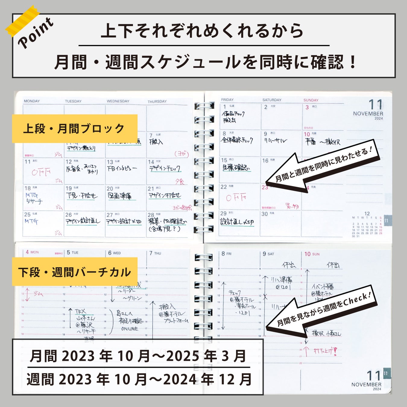 紙のよさである視認性の高さにより、月・週・日ごとの予定が把握しやすくなっています。