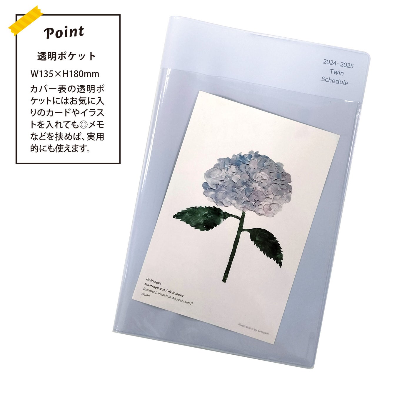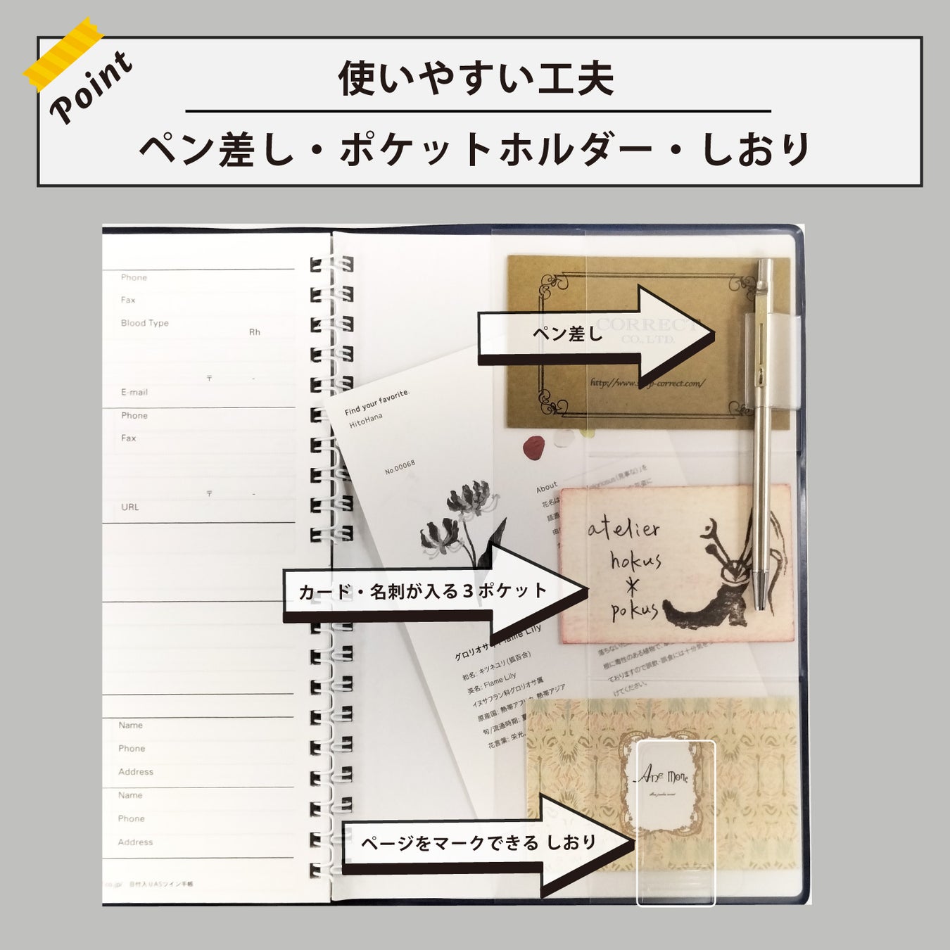 お気に入りのポストカードや写真などを入れてカスタマイズしたり、忘れがちなメモや書類を挟んだりと、使い方も色々。
