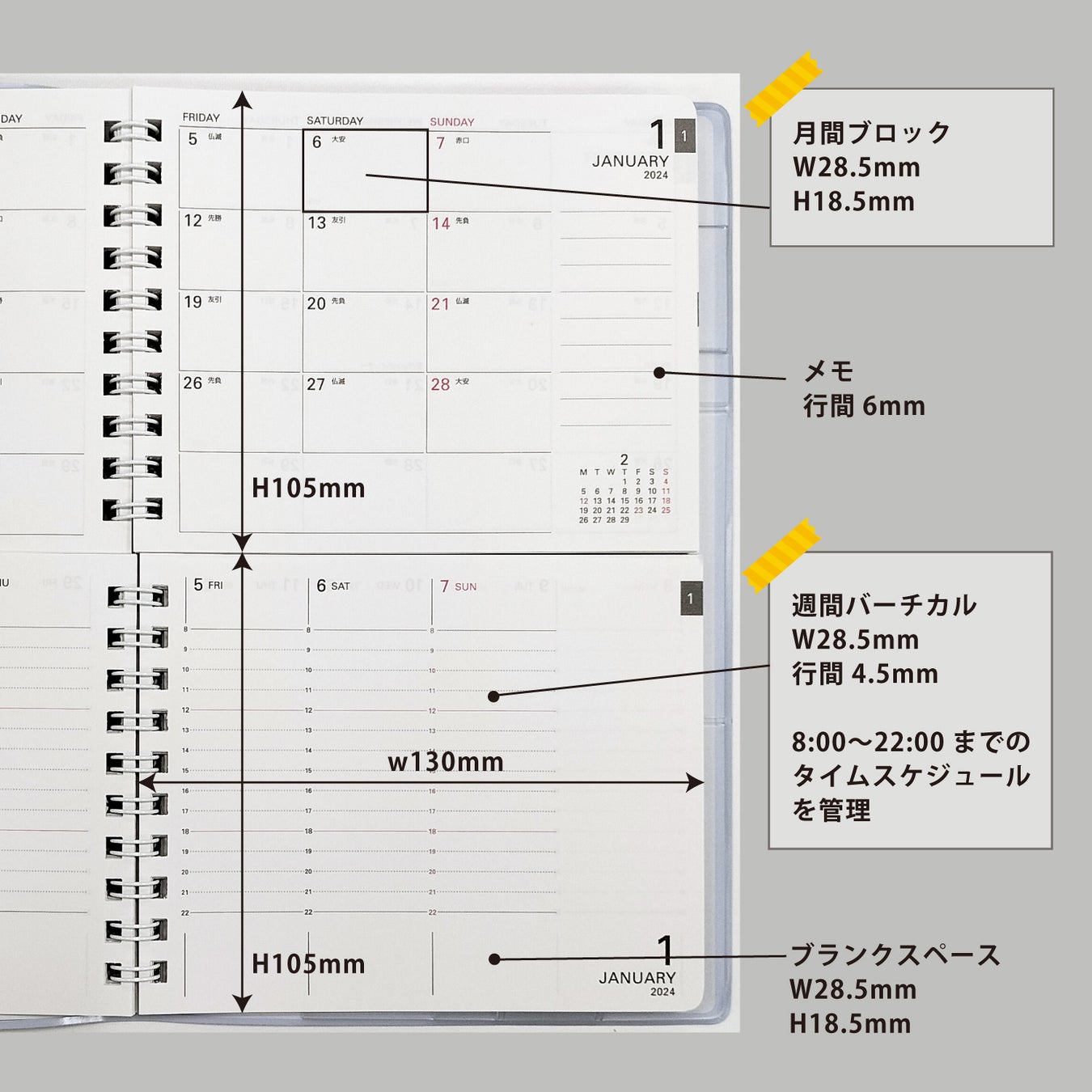 月間ページには右側にメモ欄と翌月のカレンダー、週間ページはバーチカルタイプで8時~22時の予定を書き込むことができます。