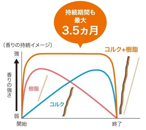 芳香液を速やかに吸い上げ、素早く香る「樹脂製スティック」と、じんわり吸い上げ、最後まで香る「コルクスティック」の2つを組み合わせることで、使いはじめから使い終わりまで上質な香りをお楽しみいただけます。一般的なリードディフューザーの使用期間は約1~2ヵ月ですが、本商品は約1.5ヵ月~最大3.5ヵ月と長くお使いいただけます。
