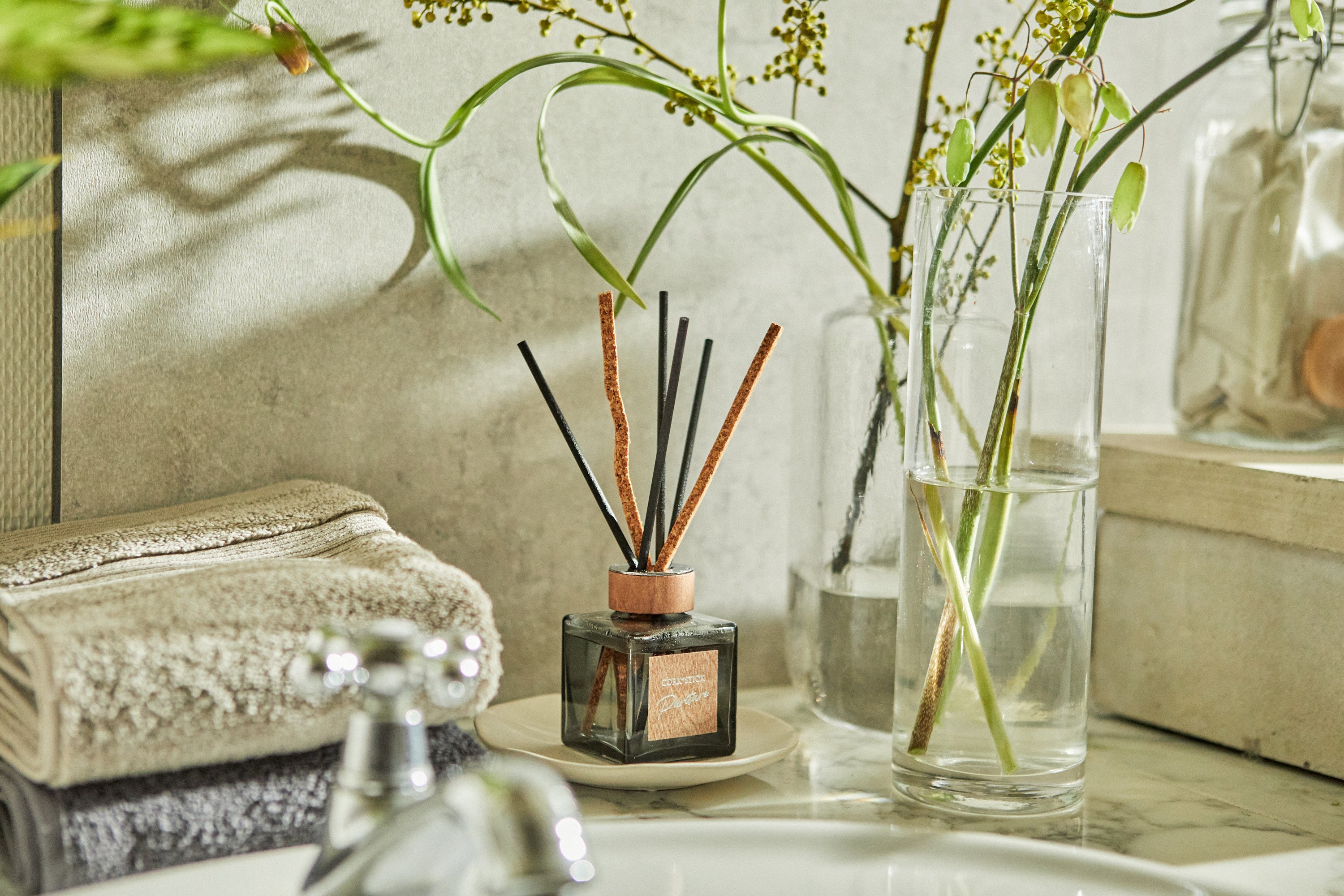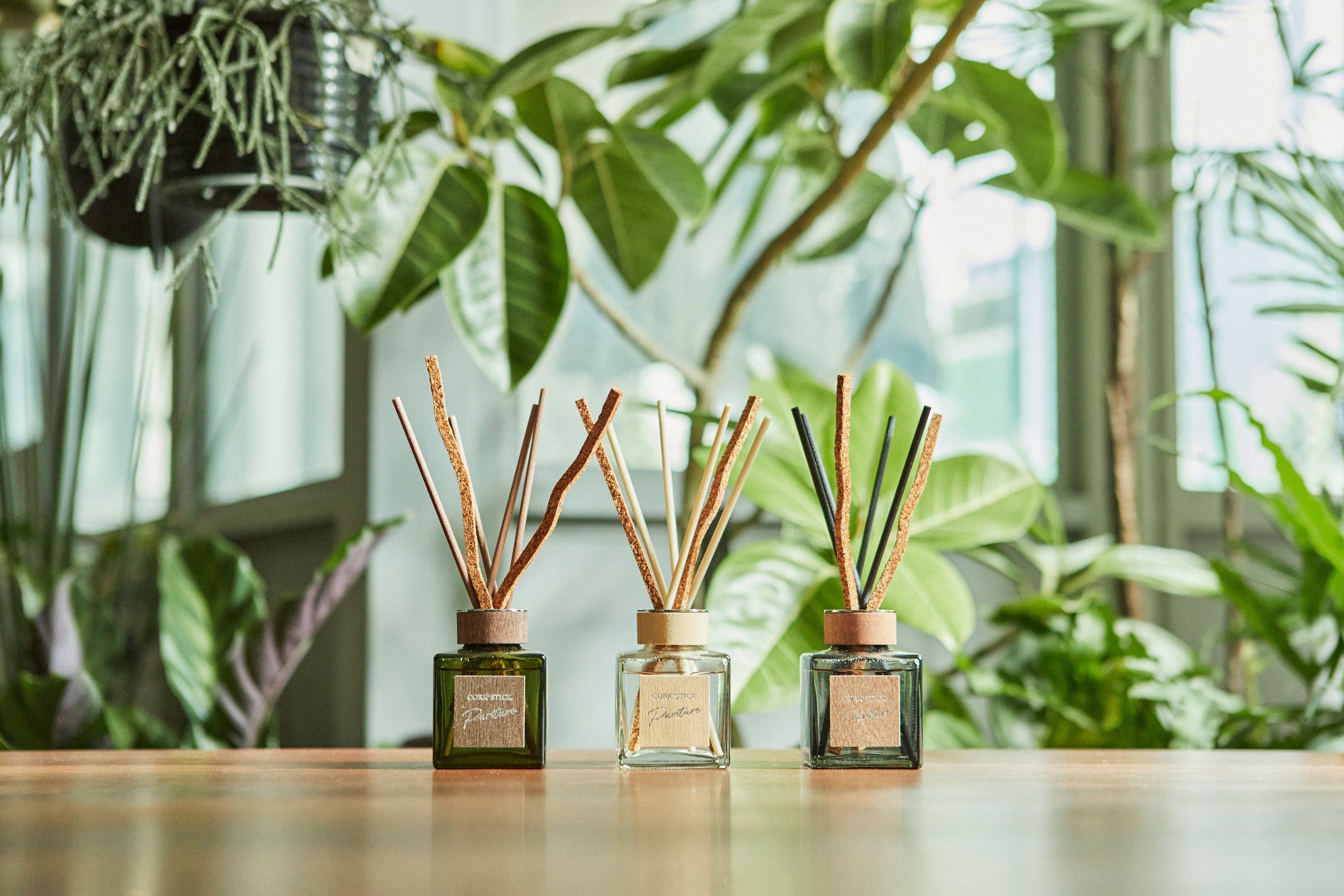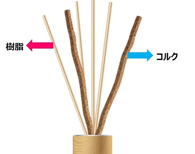 本商品は、コルクと樹脂の2種類のスティックを採用し、最後までしっかり香りが広がり、持続期間も最大3.5ヵ月※2と長くお使いいただけます。香りの持続を目的にコルクスティックを使用した芳香剤は、業界で初めてです※3。また、天然の木とガラスの質感にこだわったデザインにより、ぬくもりを感じるリラックス空間を演出します。香りは、自然を彷彿させるナチュラルテイストに仕上げた3種類をご用意しています。