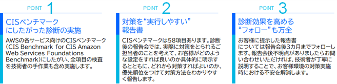 本サービスは、お客様のAWS環境におけるセキュリティ設定をチェックし、対策方法をわかりやすい報告書にまとめて提示します。その後もお客様に対するフォローを行うことにより、お客様のクラウド環境のセキュリティレベル向上に貢献いたします。