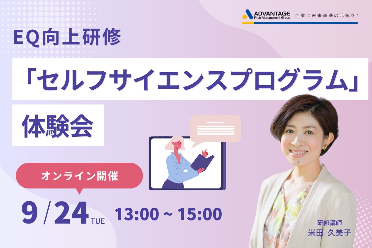 株式会社アドバンテッジリスクマネジメントは、2024年9月24日(火)に人事・人材開発・研修の責任者様/ご担当者様を対象としたWebセミナー「EQ向上研修『セルフサイエンスプログラム』体験会」を開催いたします。本セミナーは、『実際どんなことをするのかイメージが湧かない』『事前テストをどのように活用するのか知りたい』というお声を多数いただき、実際の研修内容を【一部抜粋した】体験することができます。