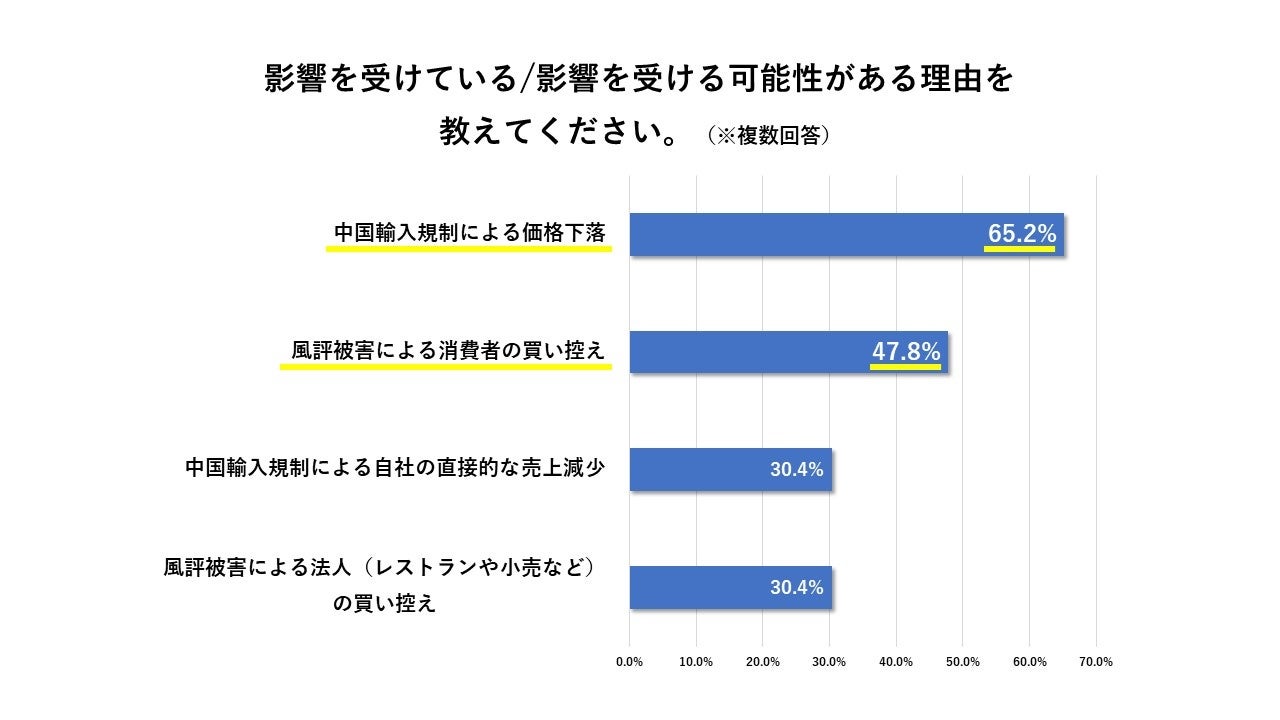その理由として、影響を受けている(受ける可能性がある)漁業者のうち65.2%が「中国輸入規制による価格下落」、47.8%が「風評被害による消費者の買い控え」と回答。