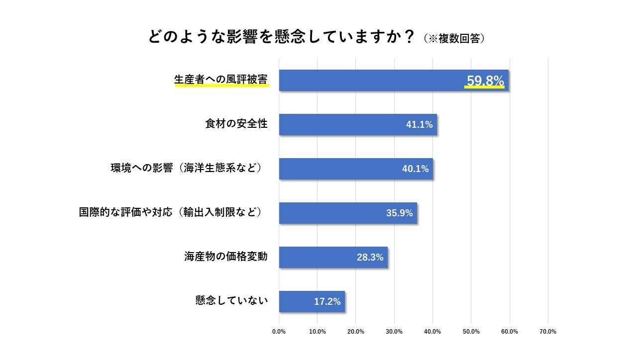 ・処理水放出による食品への影響について59.8%が「漁業者への風評被害」を懸念。「食材の安全性」よりも多い結果に。