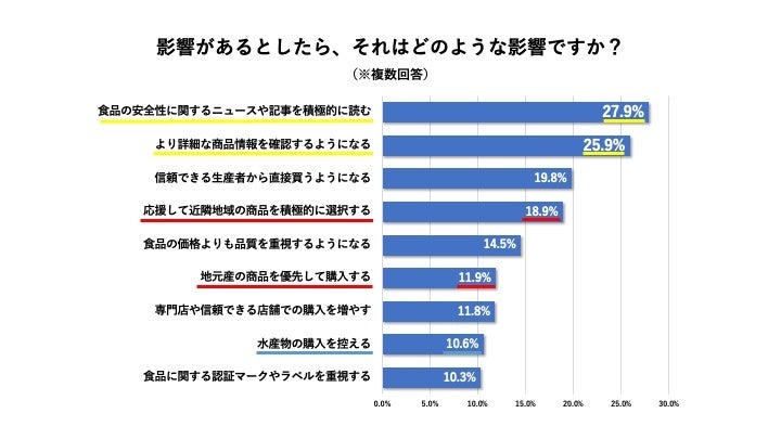 ・48.9%が、ALPS処理水が放出されたことで「消費行動に影響はない」と回答。「消費行動に影響がある」と回答した人のうち、27.9%が「食品の安全性に関するニュースや記事を積極的に読む」25.9%が「より詳細な商品情報を確認するようになる」と回答し、「海産物の購入を控える」と回答した人は全体の10.6%に留まりました。また18.9%が「応援して近隣地域の商品を積極的に選択する」と回答しており、応援意欲の高い方が多くいることもわかりました。