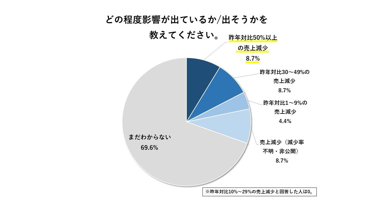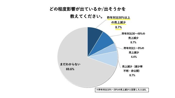 ・売上にどの程度の影響が出る見込みかという質問に対し、昨年対比30%〜49%の減少が見込まれる漁業者が8.7%、昨年対比50%以上の減少が見込まれる漁業者も8.7%という結果に。
