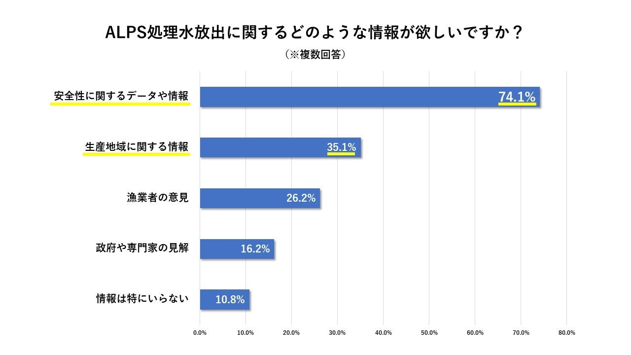 ・84.4%が、ALPS処理水放出について「詳しく知っている・大まかには知っている」と回答。どのような情報が欲しいかという問いに対して、74.1%が「安全性に関するデータや情報」、35.1%が「生産地域に関する情報」という結果に。