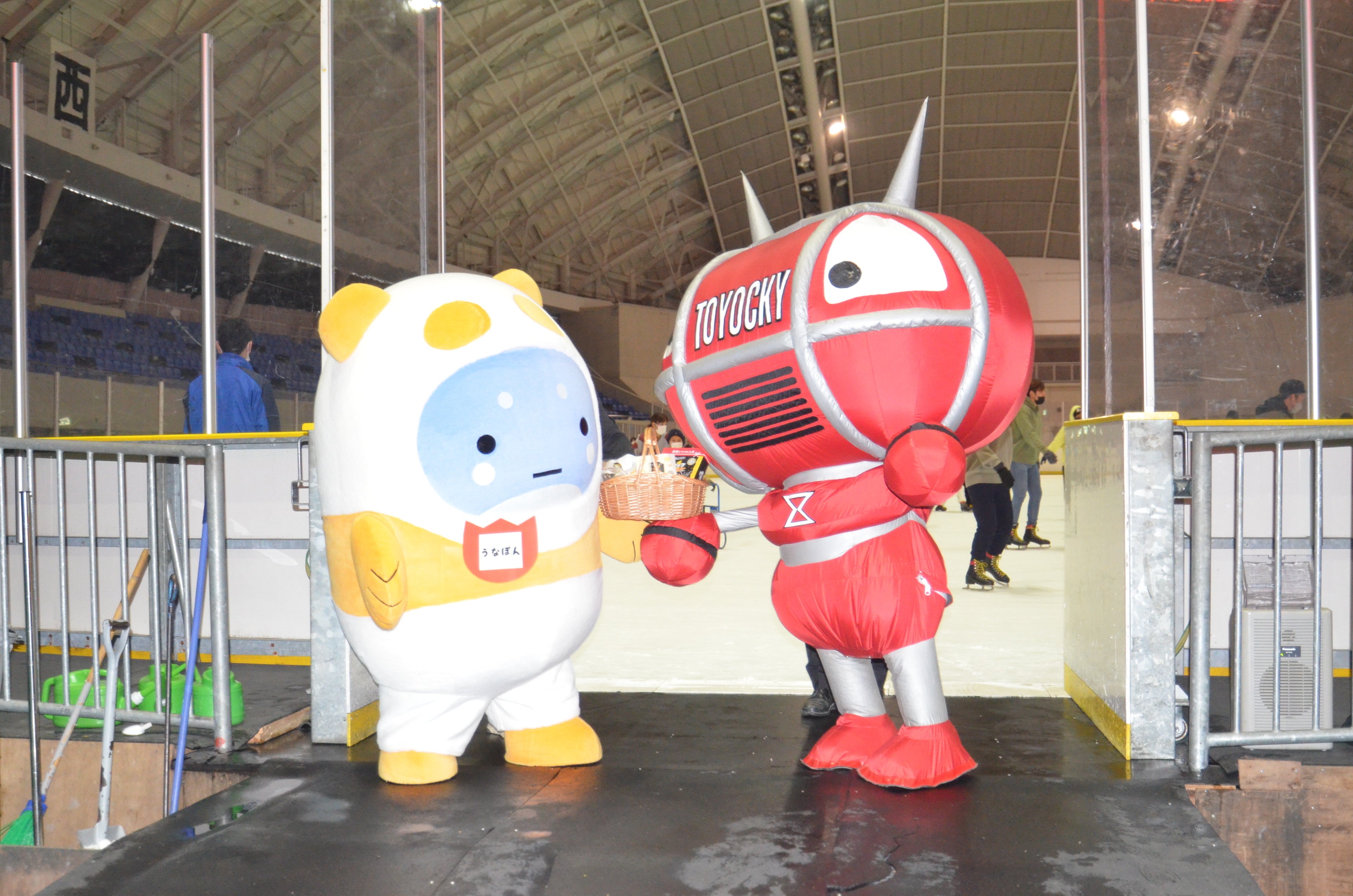 愛知県豊橋市のマスコットキャラクター「トヨッキー」のところに、隣町の静岡県湖西市から市の新しいキャラクター「うなぽん」があいさつに来ました。