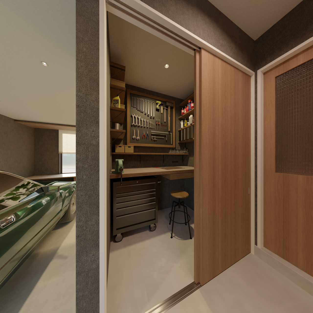 02:ガレージに繋がるワークルーム。作業台と趣味の道具を置けば、大人の秘密基地の出来上がり。