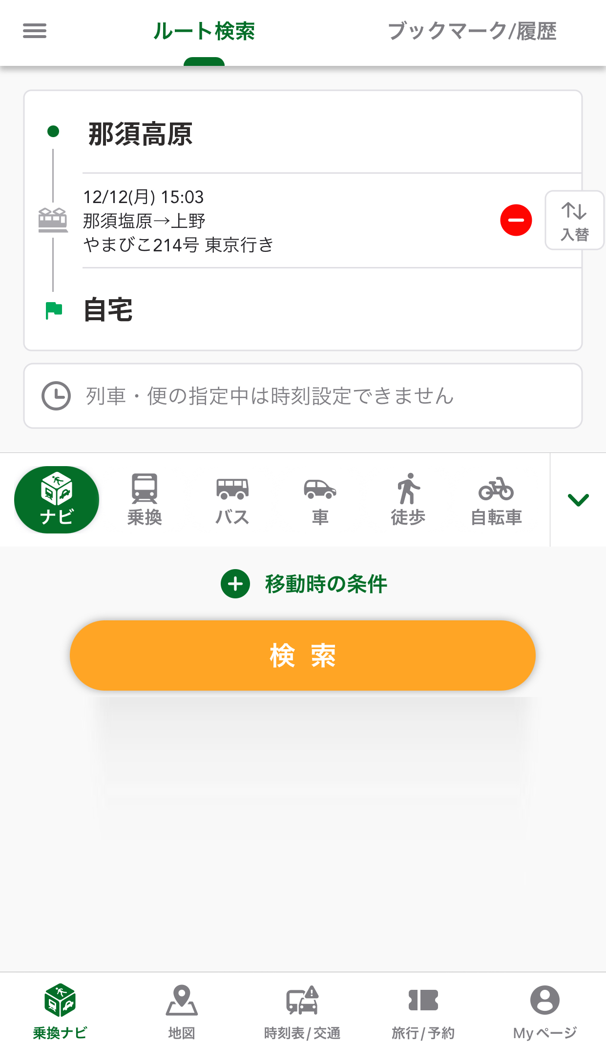 『NAVITIME』の場合は、読み取った特急券の列車を指定した状態で、自宅や最終目的地点を含めたドアtoドアの検索をすることができます。