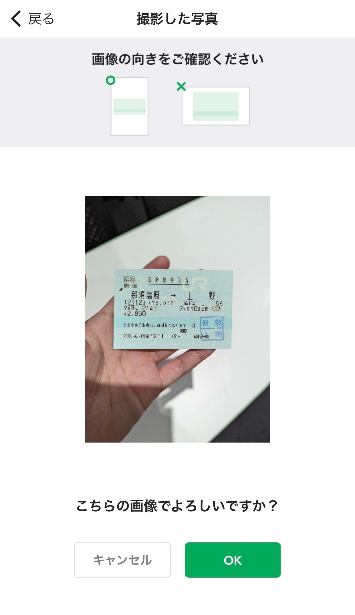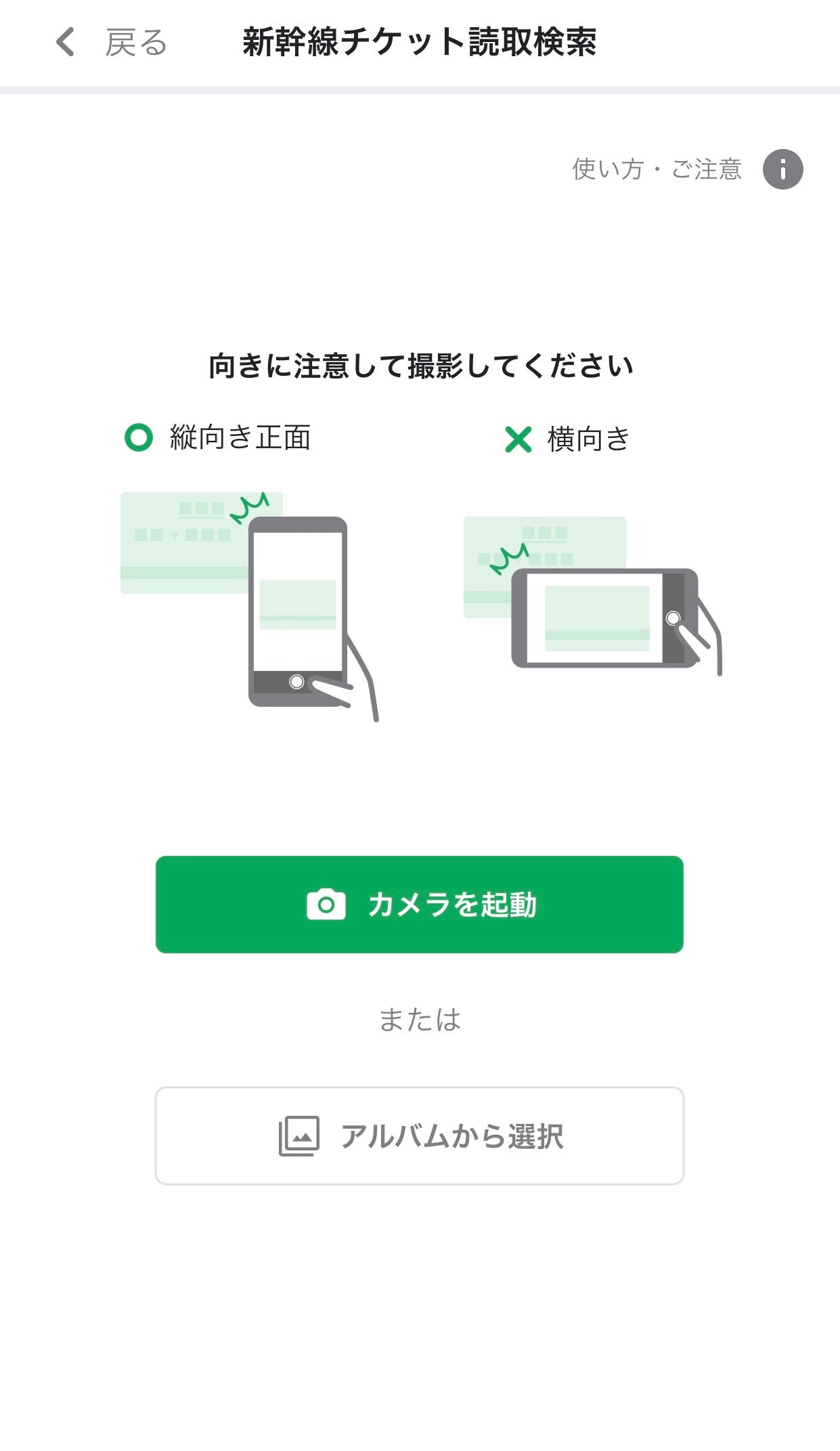 アプリのドロワーメニュー内の「新幹線チケット読取検索」ボタンを押すと、「新幹線チケット読取検索画面」が表示されるので、「カメラを起動」ボタンを押し、紙きっぷを撮影します。