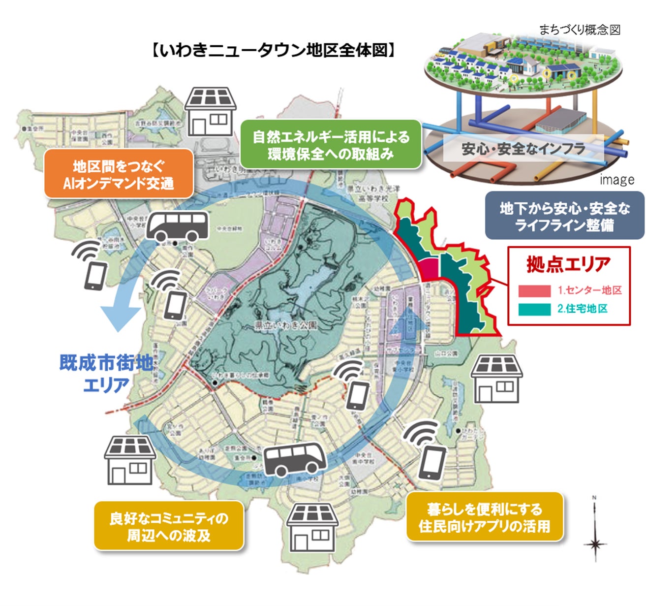 いわき市では、いわき市土地開発公社が所有する中央台高久地区の土地を、宅地開発に合わせてスマート技術などの導入を進める拠点エリアと位置づけ、当該エリアを含むいわきニュータウン全体において、スマートタウンモデル地区を実現するためのまちづくりの方向性を示す「いわきスマートタウンモデル地区基本戦略」を2022年11月に策定・公表しました。
