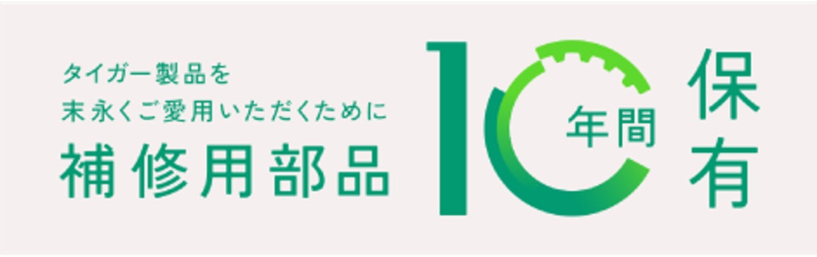 経済産業省の指導で、たとえば炊飯器なら保有期間は製造打ち切り後6年と定められておりますが、タイガー魔法瓶ではお客さまへのサービス向上のため、保有期間を全商品10年としております。