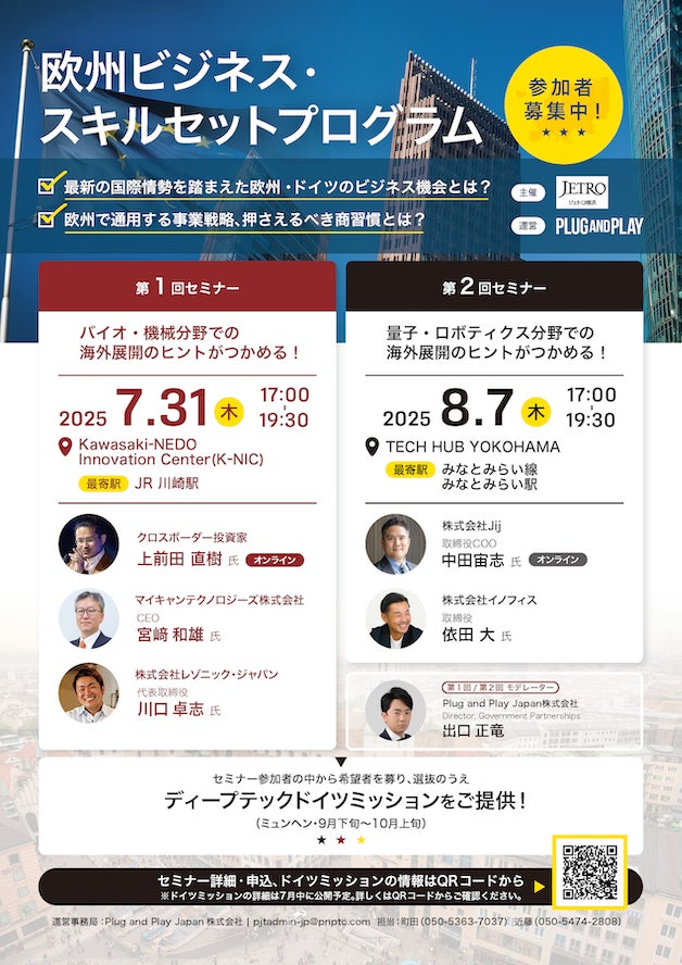 Plug and Play Japan株式会社(本社:東京都渋谷区、代表取締役社長:ヴィンセント・フィリップ、以下「当社」)は、独立行政法人日本貿易振興機構(ジェトロ)横浜貿易情報センターが公募した「横浜・川崎スタートアップ 欧州ビジネス・ドイツミッション運営」業務を受託したことをお知らせいたします。
