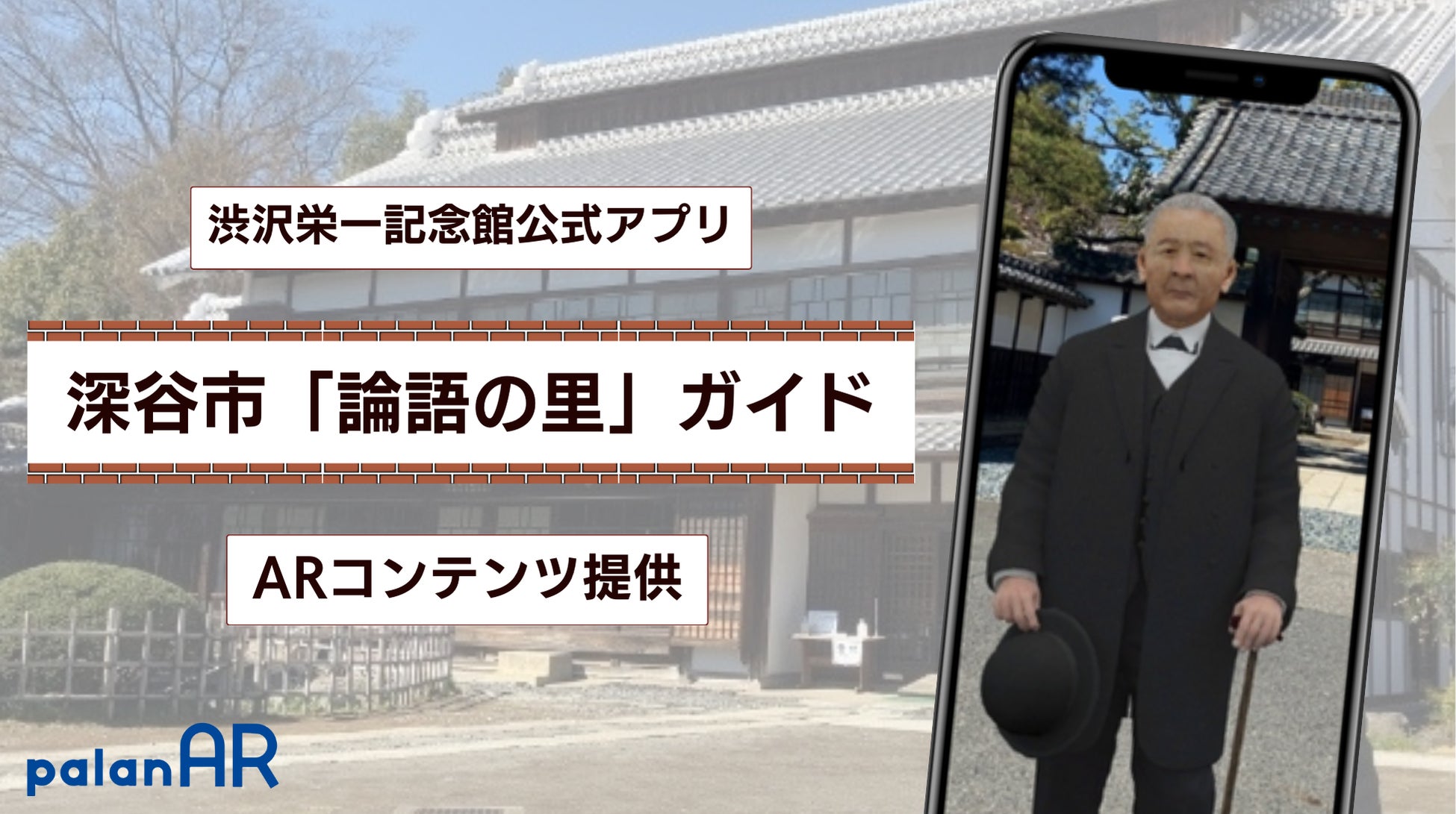 本コンテンツは、株式会社オフィス・サウスによって作成、渋沢栄一記念館によって提供されている「論語の里」エリアのまち歩きを楽しむアプリで体験いただけます。アプリに埋め込まれたpalanARを起動することで、ARの渋沢栄一との写真撮影が可能です。平面認識のため、お好きな場所で表示・撮影をお楽しみいただけます。