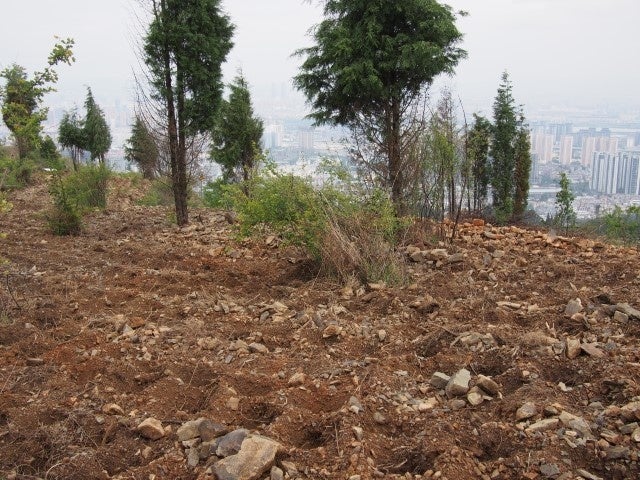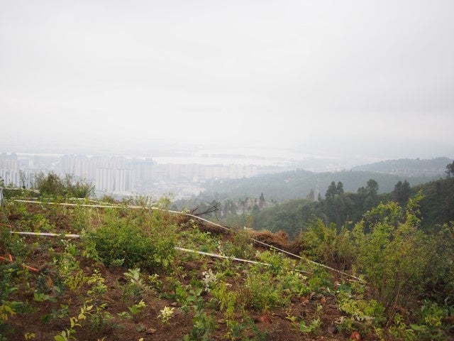当社は2020年から、雲南省楊善州緑化基金会と共同で、5か年計画の植生回復プロジェクトを開始しました。植樹場所は、雲南省最大の湖「滇池(てんち)」を見渡せる、標高2,200mの山の急斜面で、元々はユーカリの植林地でした。ユーカリの精油には引火性物質が含まれており、頻繁に山火事が発生していました。単一樹種の画一的な植樹は、生態的にも非常に脆いものです。その土地本来の森であれば、火事や地震などの自然災害にも耐えられるというのが、宮脇式植樹の特徴であり、荒廃地に常緑広葉樹を密植・混植することによって、山火事などの災害を防ぐことにもつながります。