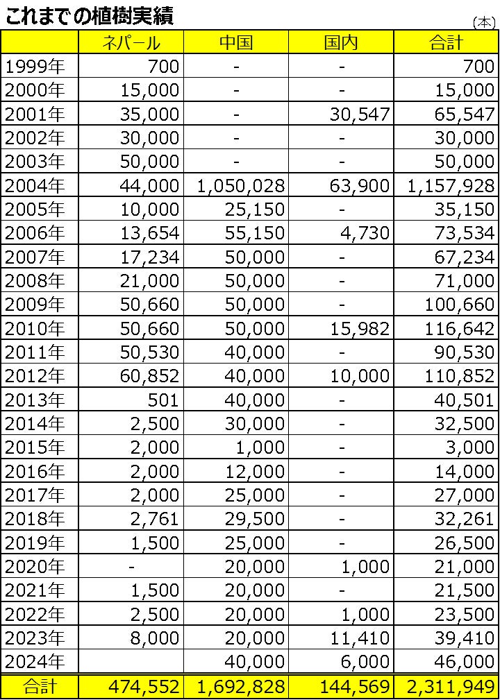 翌1999年にネパールで植樹活動を開始し、2001年からは、現地の気候風土に合った在来種の木々を密植、混植する「宮脇方式」を実践しています。これは、植物生態学の権威である横浜国立大学名誉教授の故・宮脇昭(みやわき あきら)氏が提唱する植樹方法です。