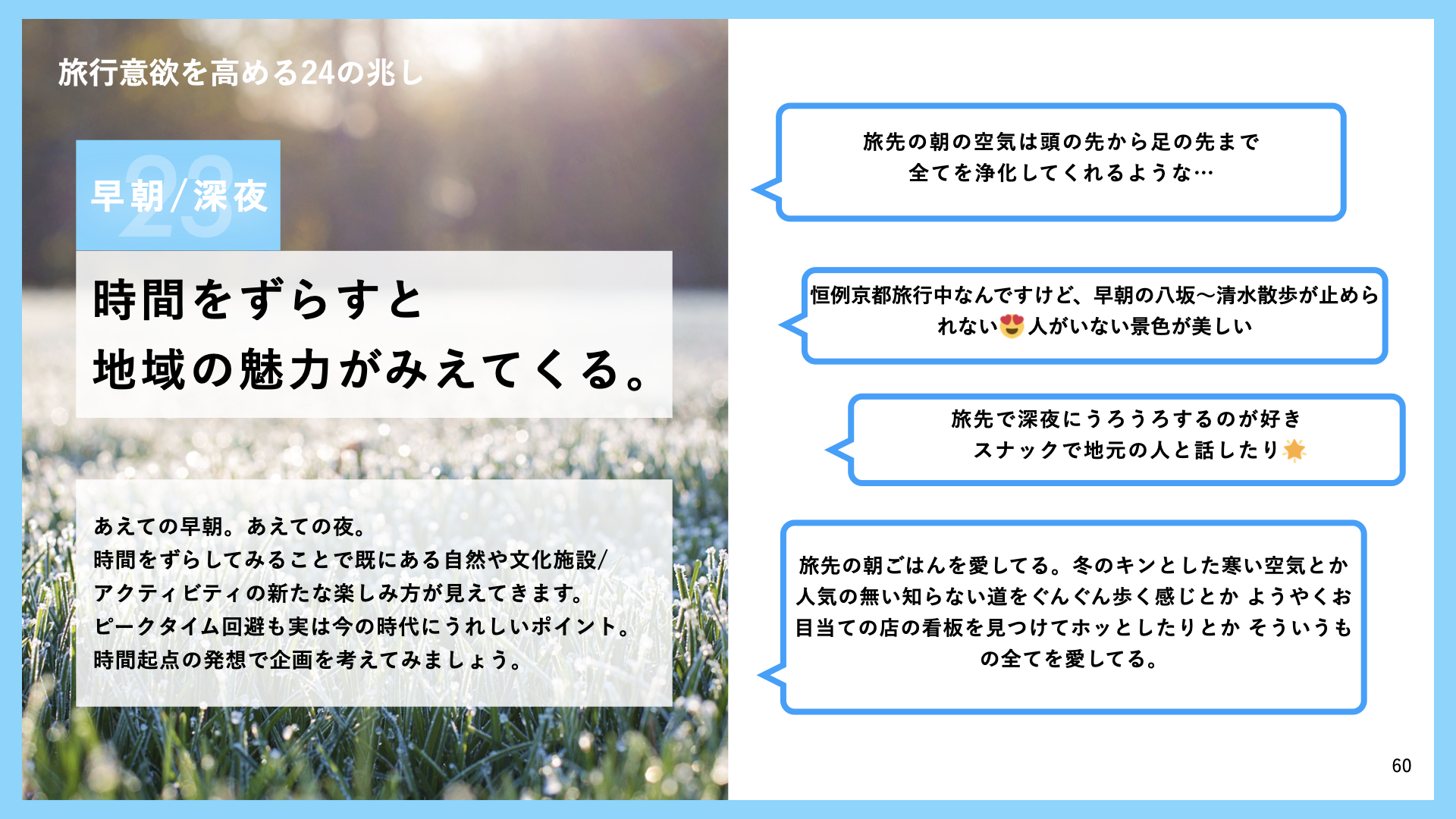 今回の観光復興ガイド第三弾で初登場となった兆しの内、今回初めて分析にあがってきた兆しである「繋がり旅」「早朝/深夜」について、ガイドにも掲載の事例を一部ご紹介させていただきます。一人旅から現地での繋がりを求める「繋がり旅」、ピークタイム回避にもつながる「早朝/深夜」の活動は、いずれもコロナ禍においても特徴的な兆しであると考えています。