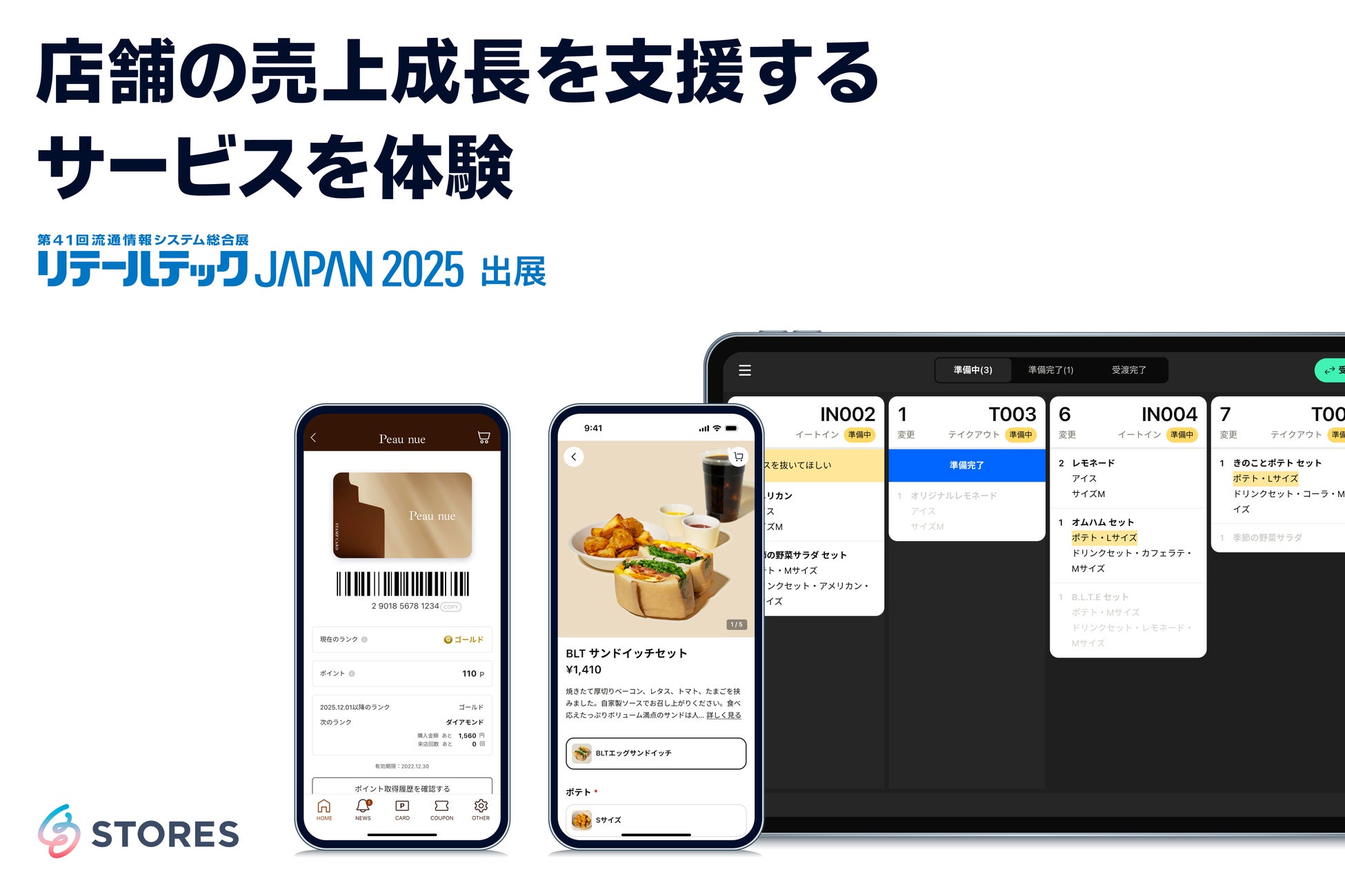 STORES 株式会社(以下、STORES)は、2025年3月4日(火)〜7日(金)に東京ビッグサイトで行われる「リテールテック JAPAN 2025」に出展します。STORES のブースでは、オムニチャネルCRM(顧客関係管理)を実現する「モバイルアプリの構築サービス」や、オムニチャネルに対応した「ポイント・顧客管理システム」、テイクアウト注文を受け付けられる「モバイルオーダーサービス」など、小売・飲食店のリピーター増加や売上アップを支援する、複数の STORES サービスを体験いただけます。