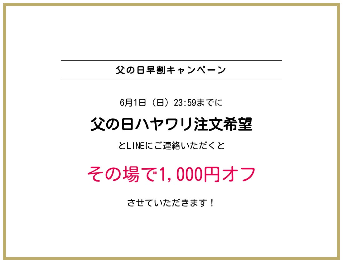 さらに、6月1日までに「父の日ハヤワリ注文希望」とLINEでご連絡いただければ、1000円オフになるキャンペーンも実施中です。