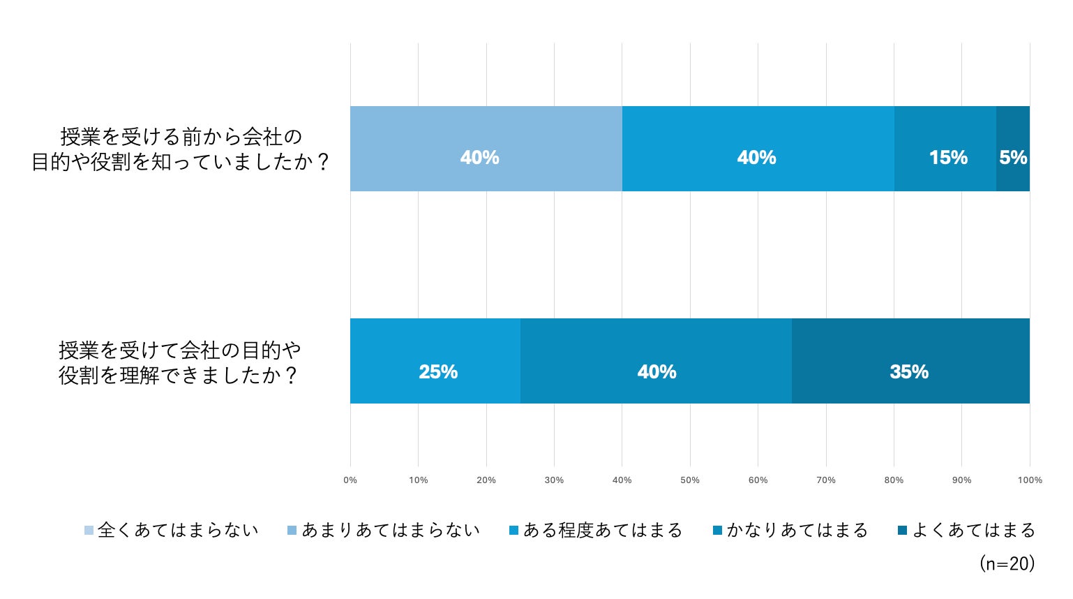 授業前は会社の目的や役割についてよく理解できていると回答した生徒は20%ほどだったのに対して、授業後は「ある程度あてはまる」が25%、「かなりあてはまる」が40%、「よくあてはまる」が35%という結果で、75%の生徒が会社についてよく理解したということがわかりました。