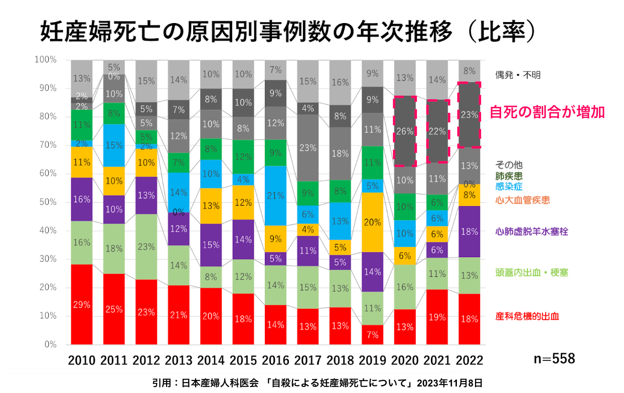 日本産婦人科医会の調査(2023)※2 によれば、2020年以降、妊産婦が亡くなった原因として自死の割合が増加した、と発表し深刻化しています。厚生労働省では産後ケアが母子保健法に位置付けられ産後ケア事業の拡充が進められています。