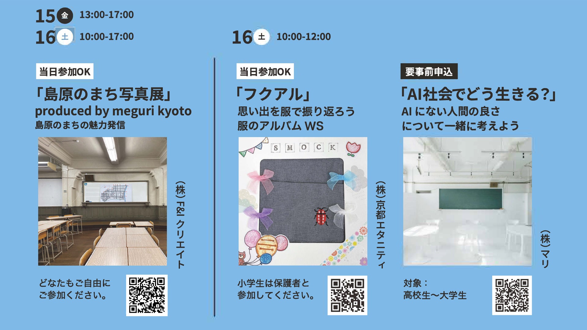 本イベントでは、淳風bizQの入居企業3社による「まちの魅力を発信する写真展」「家族の思い出を残すアルバムづくり」「AIの未来を考えるワークショップ」などを実施します。皆様のご来場をお待ちしています。