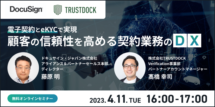 株式会社TRUSTDOCK(本社:東京都千代田区、以下TRUSTDOCK)とドキュサイン・ジャパン株式会社(本社:東京都港区、以下ドキュサイン)は、無料ウェビナー「電子契約とeKYCで実現、顧客の信頼性を高める契約業務のDX」を2023年4月11日(火)に開催いたします。