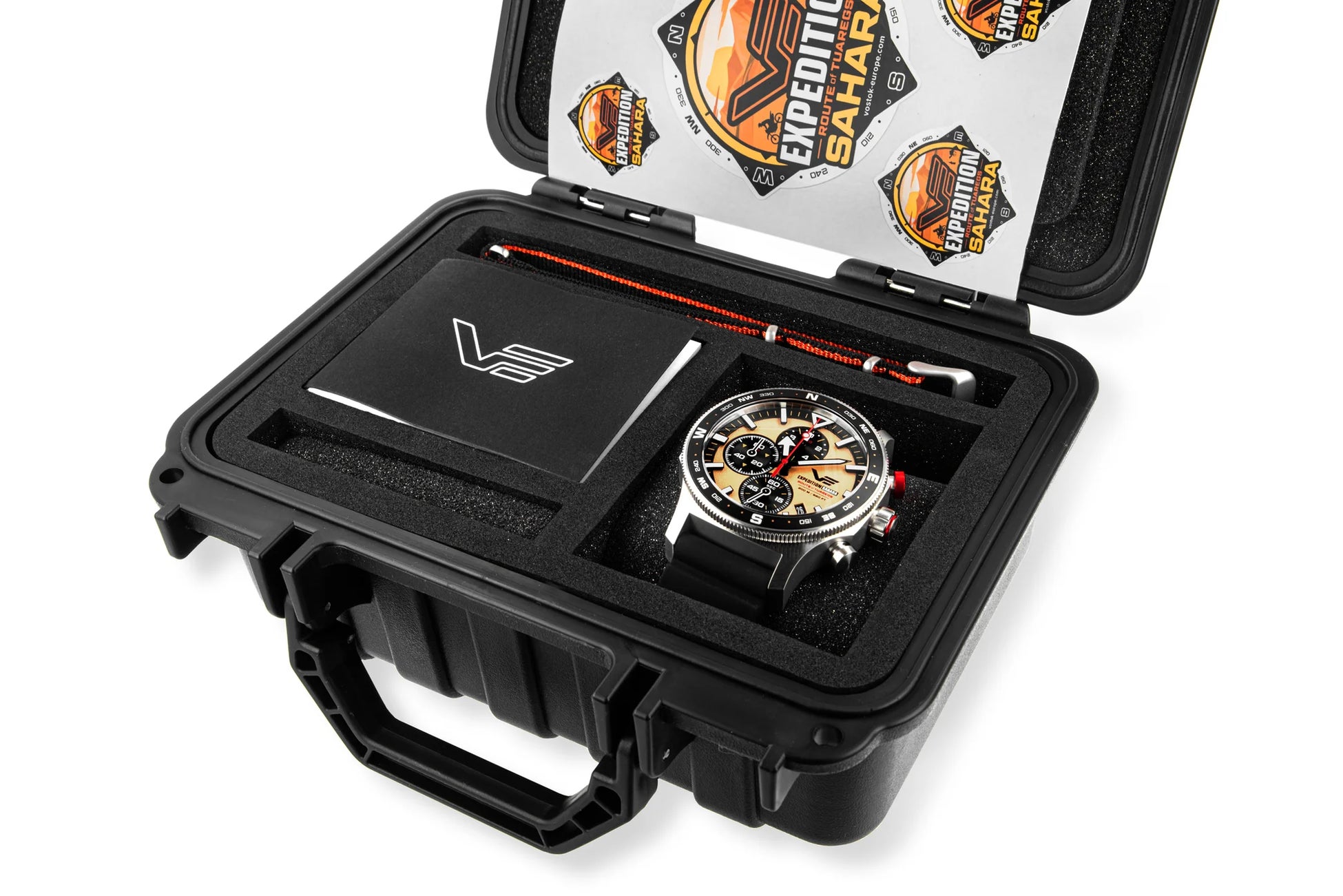 時計本体、VE DryBox Lケース、ブラックシリコンストラップ、テキスタイルストラップ、化粧箱、取扱説明書英語/日本語、ステッカー※ステッカーは、蓋裏側のスポンジ内に格納されています。