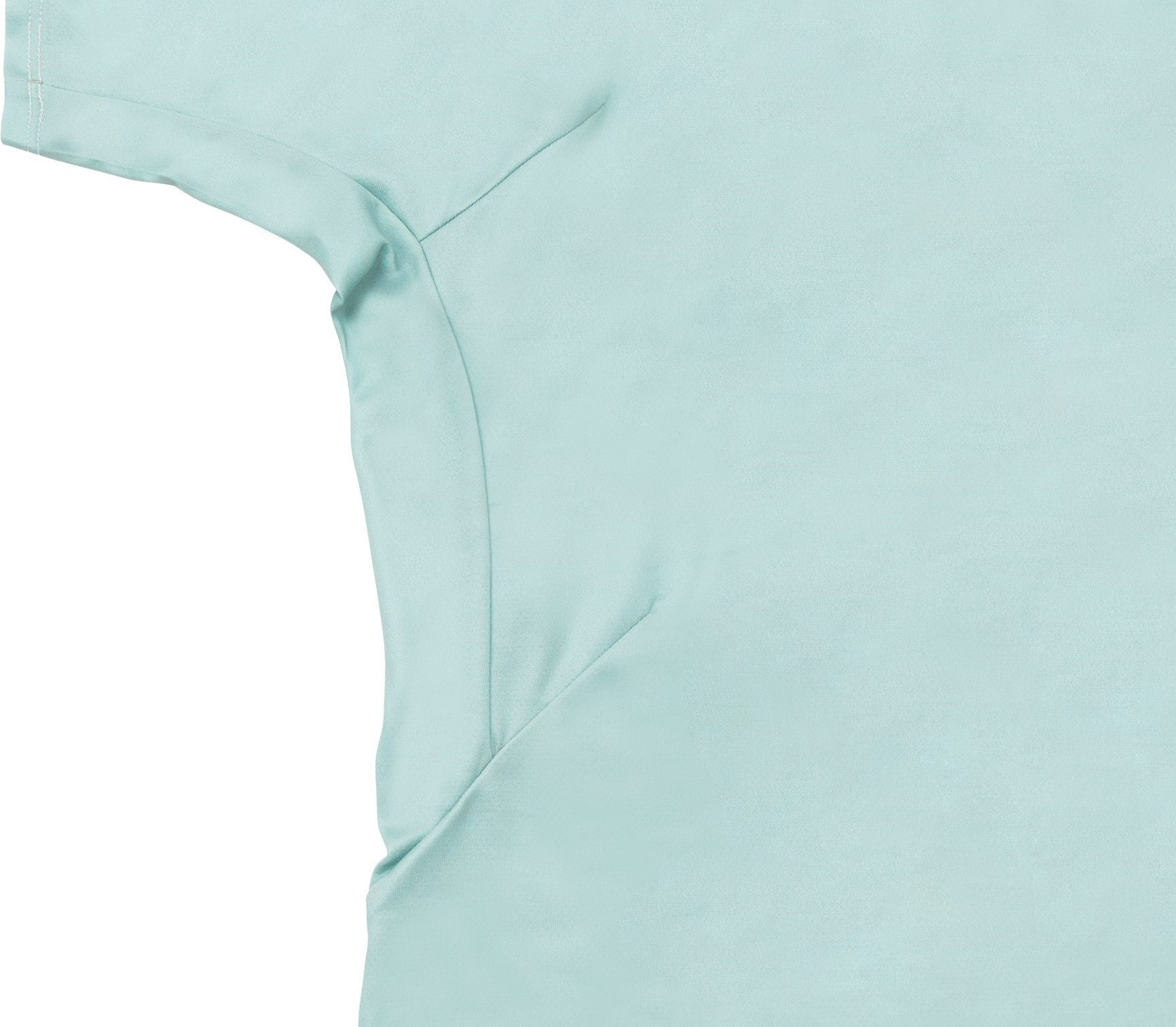 袖が上向きになった、翼をイメージした特徴的な形状のパターン設計。大きく腕をあげるテニスのサーブ時に腕が動かしやすいよう肩回りや脇の生地のツッパリ感を軽減します。