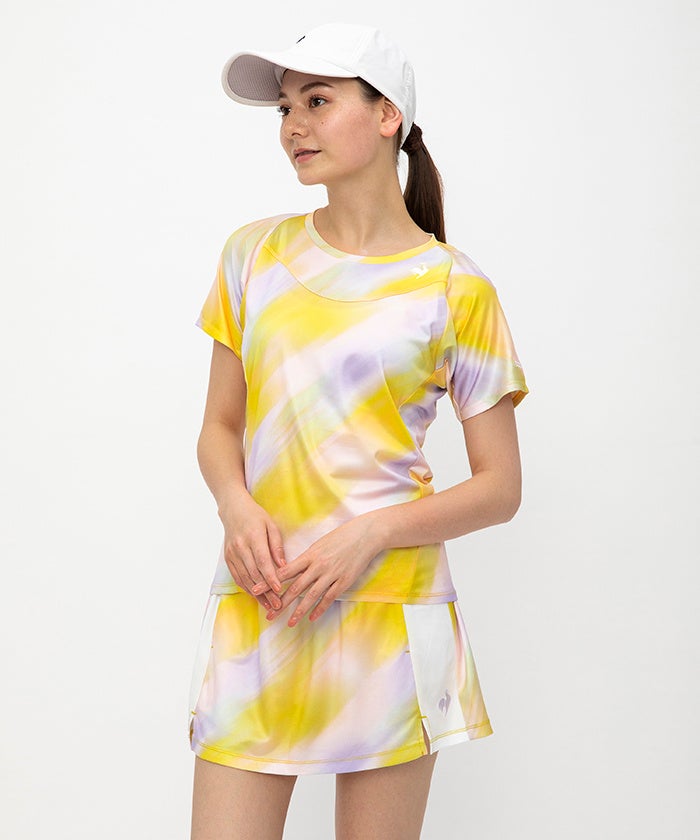 1番の特徴は、”翼”をイメージした上向きの袖。サーブ時に腕を上にあげた際、生地のツッパリを軽減します。他にも、ダブルダーツや背面1枚構造を特徴としており、テニスの基本動作を当社のアパレル研究開発拠点「DISC OSAKA(ディスク オオサカ)」にて検証し開発した独自パターンです。(特許出願中)