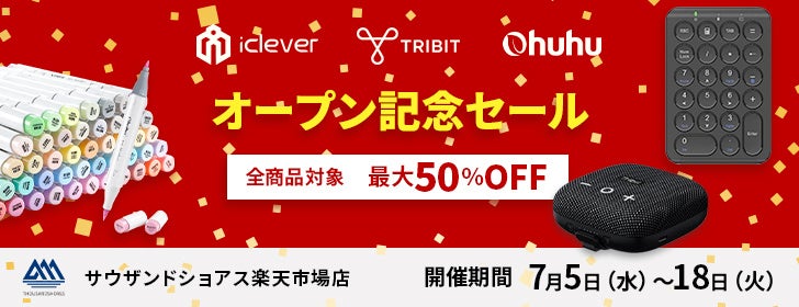 日本、アメリカ、カナダ、イギリス、スペイン、ドイツをはじめ20数か国向けに700を超える高品質なPC周辺機器や日用雑貨などの製品を提供するサウザンドショアス株式会社は、楽天市場にて新店舗「サウザンドショアス楽天市場店」をオープンしました。オープンを記念し、2023年7月5日(水)~ 18日(火)までサウザンドショアス楽天市場店にて、【iClever】【Ohuhu】【Tribit】の3ブランドで全商品を対象に、最大50%OFFで販売するオープン記念セールを開催いたします。