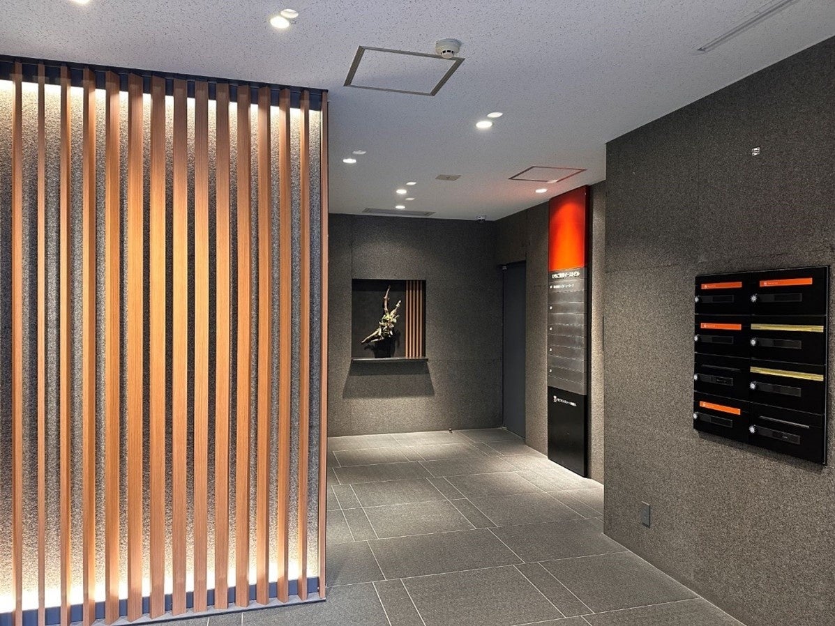 また、1階のエントランスは、2021年にリニューアル工事を実施しており、天井照明のLED化と特徴的なデザイン壁を施したことにより、スタイリッシュで落ち着いた空間を演出しました。